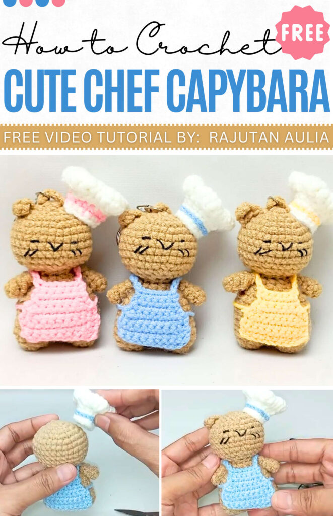 This is my favorite sleepy capybara variation and is designed a bit differently from the standard base. You can call them capybara chef dolls, and crochet the apron and hat in any color from yellow to pink and blue.