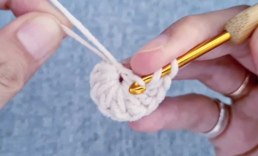 - R1: MR, ch 2 (counts as first dc), 13 dc into ring. Sl st to join. (13)