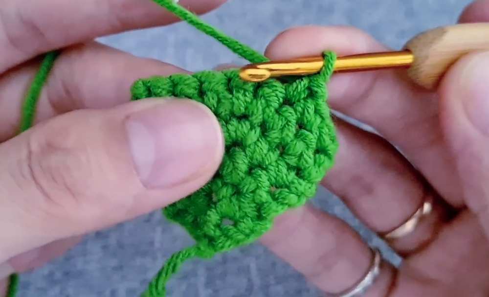 - Row 5: 3 dc, inc, 3 dc. ch 1, turn. (7)
