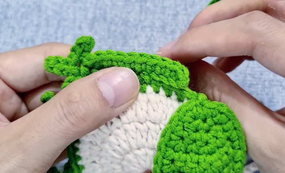 - Bottom Feet: At stitch 16 and stitch 21, create a tiny foot: (ch 3, sl st 3; ch 2, sl st 2; ch 2, sl st 2), then sl st back into the main stitch.