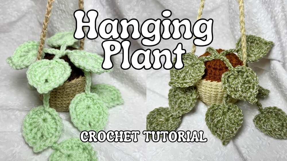 You’ll crochet three or more long leaves by chaining 13 and working different stitch heights—starting with slip stitches at the tip, growing into half-double and double crochets, and then mirroring the same stitches on the other side. The “soil” is a simple brown circle of double crochets that you attach the leaves to before sewing it onto a stuffed, bucket-shaped pot. To finish, add a long chain handle to the top of the pot so the plant can be hung up.