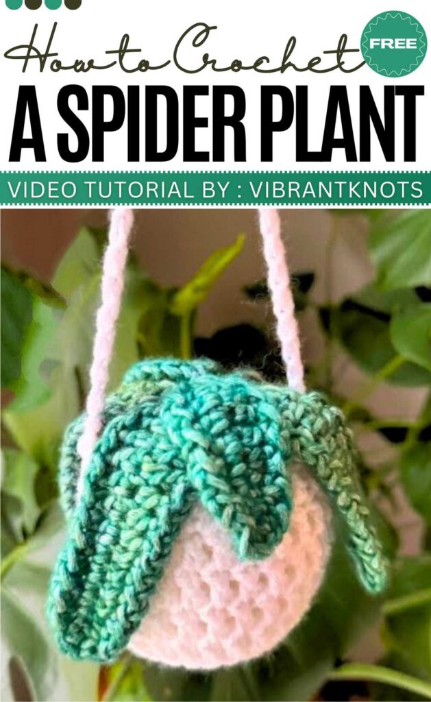 The Spider Plant is a great way to use up green scrap yarn, featuring long, pointed leaves and a small hanging pot. The pattern includes a textured border on the leaves that makes them look more realistic and detailed.