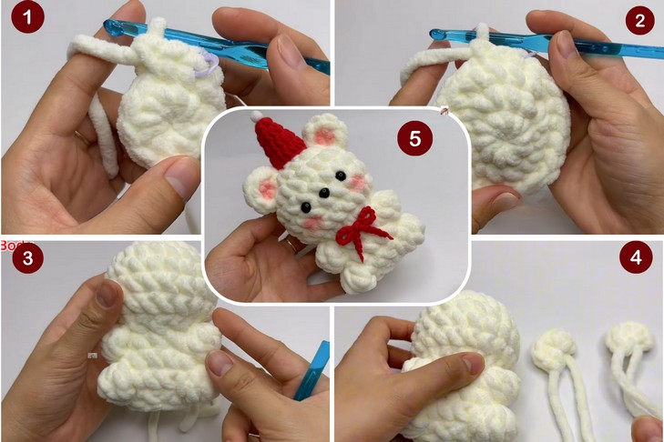 Skill Level: Beginner β Intermediate. The polar bear body starts from the head to the body with a magic ring, followed by single crochet, increase, and decrease for the head. Before starting the body, you will crochet the arm in FLO using the combination of cluster stitch, one stitch, and BLO insertion. The legs also use the same pattern as the legs. The ears are simply a crochet circle without a slip stitch join that needs sewing onto the head. Place the eyes correctly using glue. For the hat, you will need color changes and a double crochet increase pattern by working in the round.