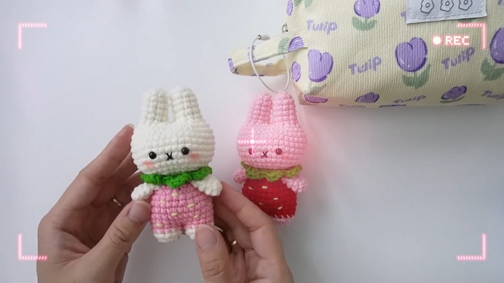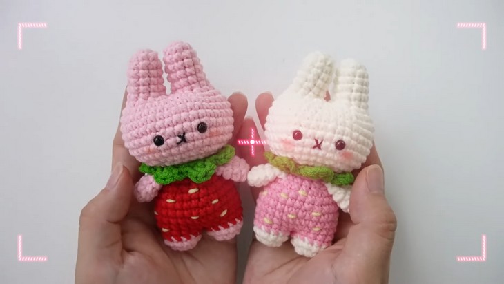 About the Designer: The designer behind these strawberry bunny amigurumi is @BigBearCraft – in her small tutorial library of 42, she always presents sets of mini amigurumi with irresistible customizations. For example, check her 7-in-1 mini Sanrio octopuses, 4 strawberry donuts, and 6-in-1 heart Christmas ornaments. I love her Christmas series that includes a polar bear, Reindeer, baubles, donut ornaments, and more exciting patterns. Other projects include mini Miffy keychains, a rose bouquet that transforms into a coaster, cloud amigurumi, and a capybara glasses holder. So, check her promising library for sure!