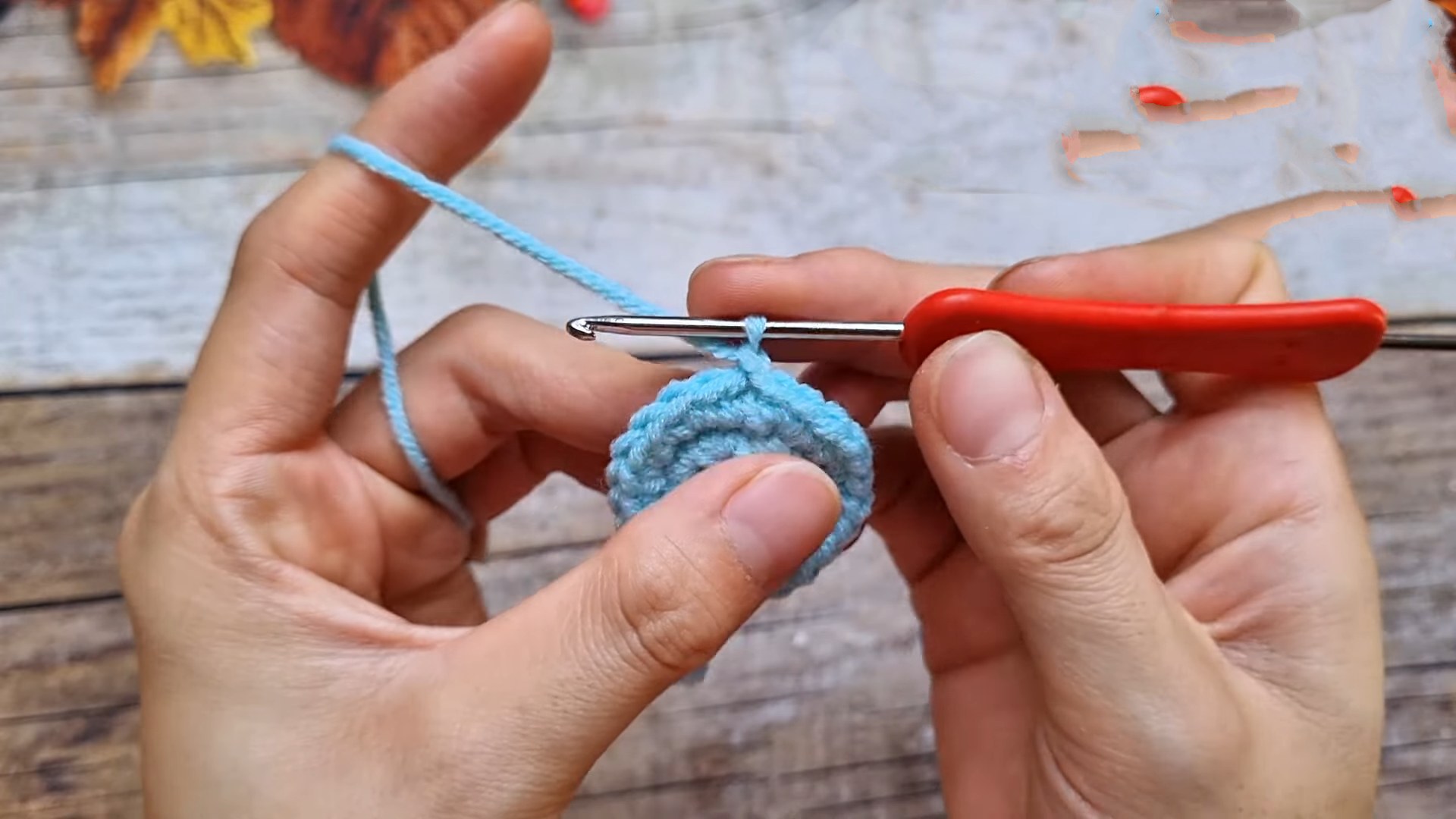 Fasten off, fold base, and sew to Head (between R2 and R3).
