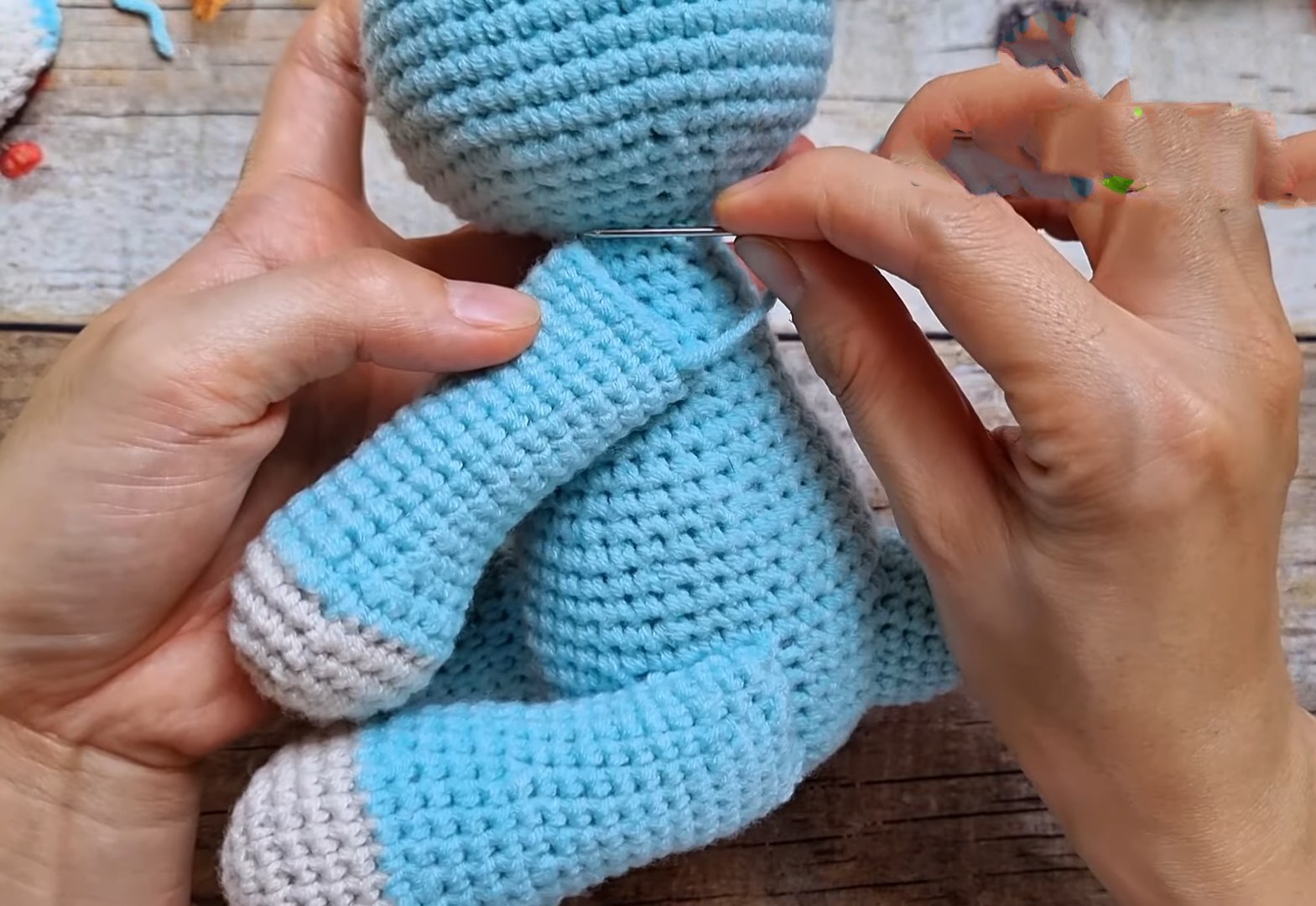 Sew Arms to the sides of the body near the neck (approx R2-R3 from top of body).