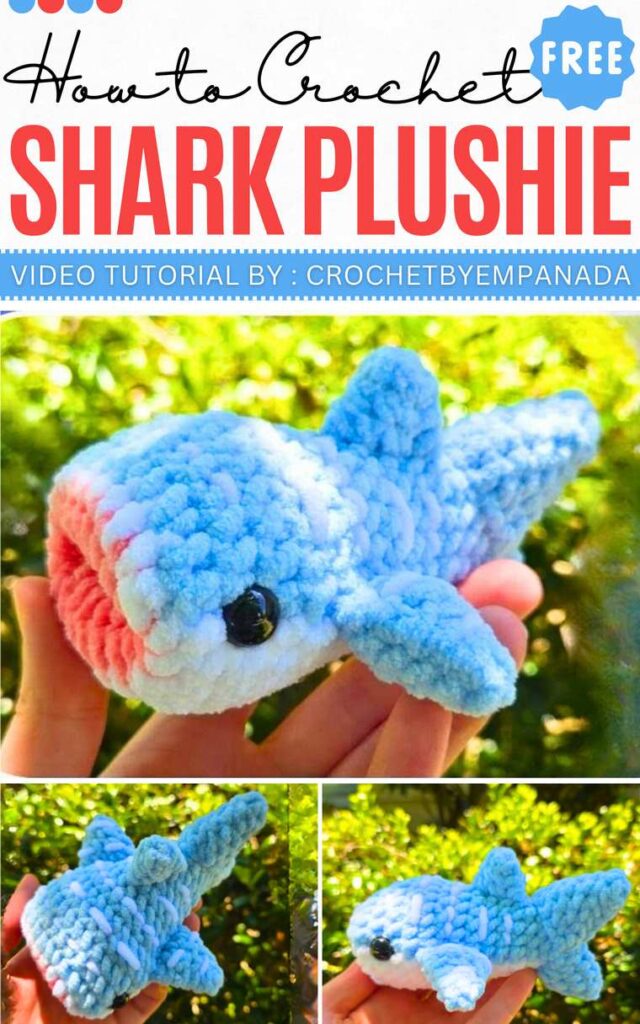 Here is how to crochet a kawaii shark plush with an open mouth, big eyes, and embroidery spots. This crochet plushie is miniature and features two colors (blue and white).