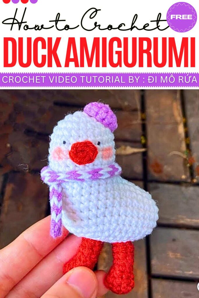 Crochet the body and long neck as one white piece, stuffing it as you go. Crochet the wings separately and sew them to the sides. Use orange yarn for the small beak and flat feet. To finish, add black safety eyes and a colorful tiny scarf.