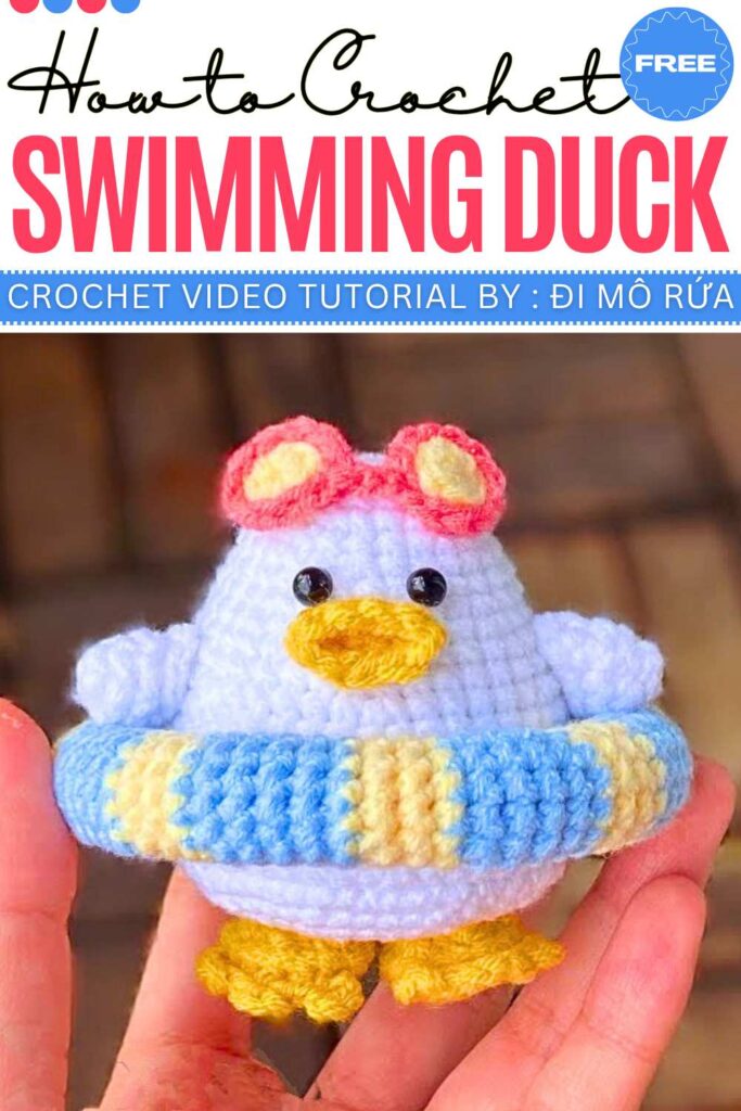 Crochet the duck’s body, wings, feet, and beak separately. Start with a stuffed yellow ball for the body, then add the wings, webbed feet, and an orange oval beak. For the swim ring, crochet a long striped tube, stuff it, and join it into a circle. Finally, assemble the pieces and add safety eyes and tiny sunglasses.