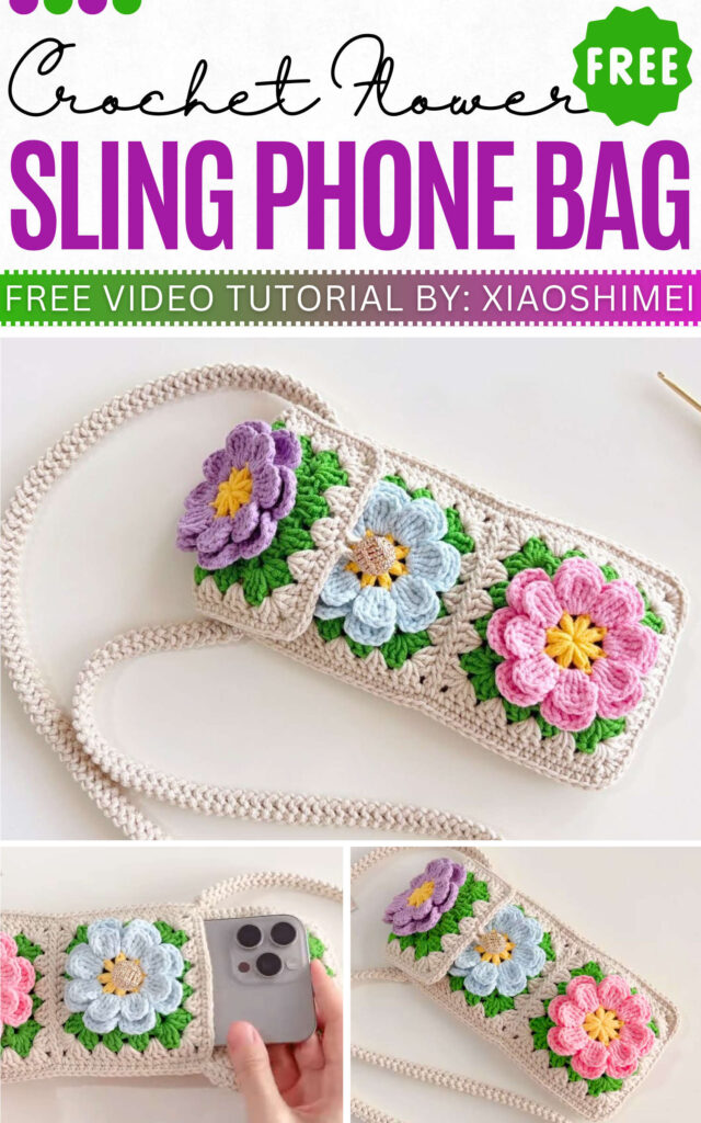 As I mentioned, this crochet sling phone bag is so elegant and detailed. To elaborate, see 3D flower motifs (yes, it is crocheted by sewing three for the front panel) each with two layers of petal.