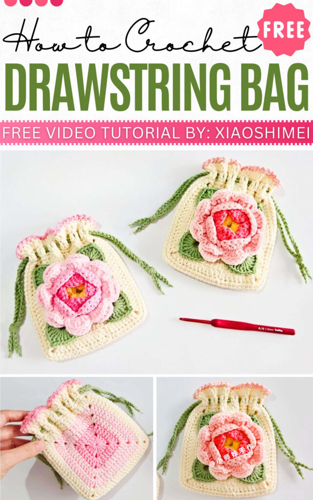 With additional crocheting for the drawstrings (yes, its a large drawstring bag), this ends up so beautifully. The flower will be six-petal, crocheted using three yarn colors per bag with a leaves for the strings, too. So, why waiting, crochet one!