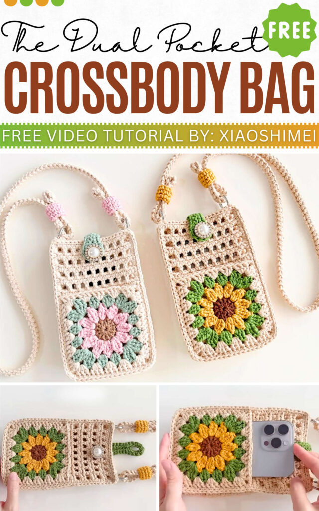 This crossbody flower bag has a classic sunburst granny square, mesh stitch panel, a small flap and opening just for button and more. It feels to me intermediate one though the next one is even more involved.
