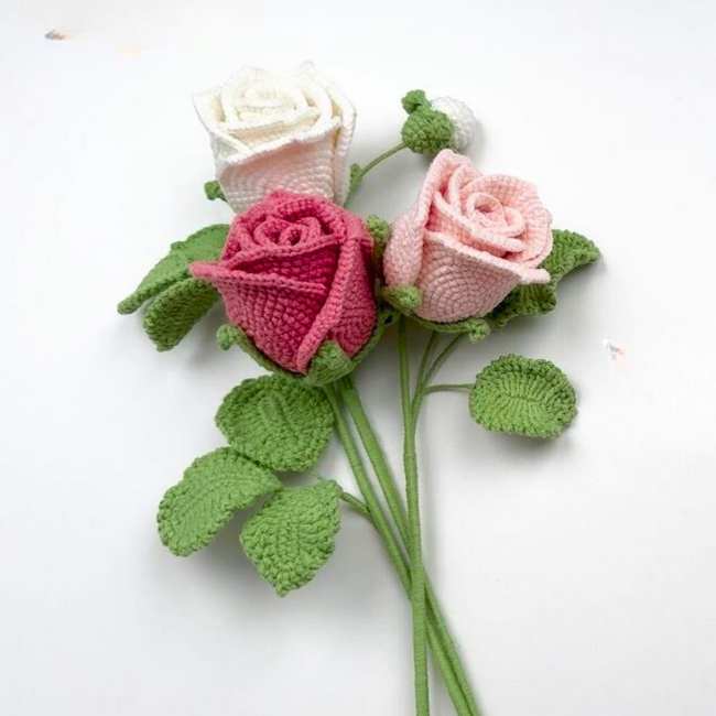 You have to crochet three rose flowers from the above method in orange, yellow, and grey. You can assemble the whole with a pair of leaves, too.