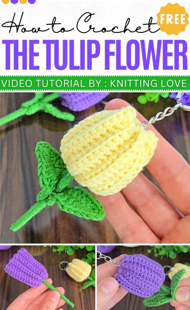 Follow this tutorial for a clever method to crochet a stuffed tulip plant with leaves and craft wire stem. You will learn how to crochet a tulip bloom from a ribbed rectangle in purple or yellow. This stuffed tulip is perfect to use as a keychain, especially when you crochet a pair.