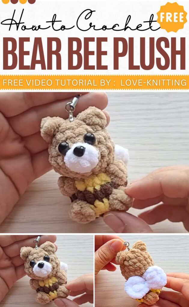 As a Love Gift during spring, crochet this no-sew and mini bee teddy bear plushie with working only on 11 rounds. The wings are crocheted later, working from top to bottom. First, crochet the head, the muzzle, arms, legs, and tail.