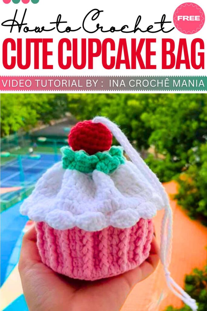 Start with a double-crochet circular base and work upward in back-post stitches to create a ribbed liner. Crochet a frosting top with rounds of double crochets and a scalloped ruffle edge. Add a drawstring chain to close the base, then finish with a red cherry on top and a braided strap.
