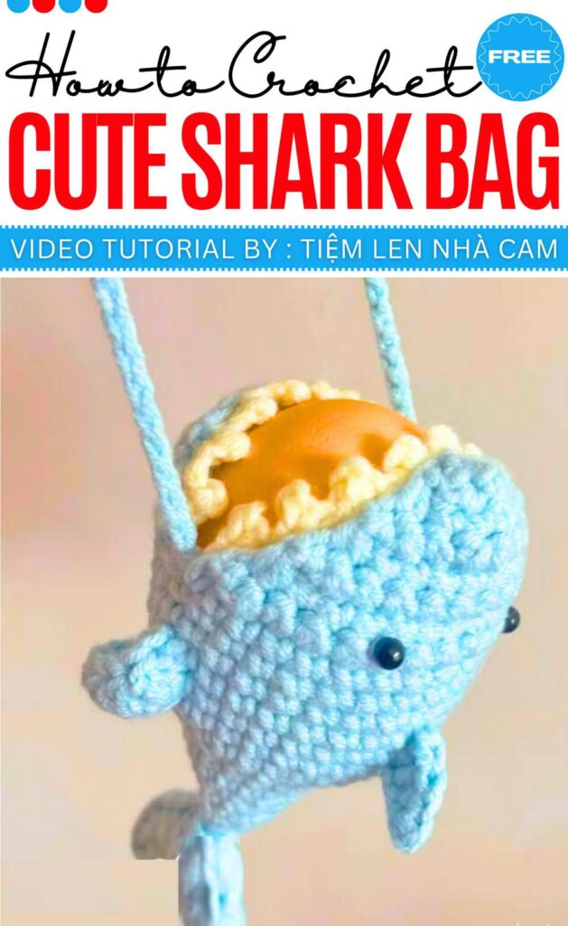 Start with a 6-stitch magic ring and increase to form a rounded body. Create the open mouth by working the jaws in decreasing rows, then sew a white peak-stitch chain along the edges for teeth. Crochet and attach a small top fin, a longer bottom fin, and a V-shaped tail. Finish with eyes and a long chain-stitch strap.