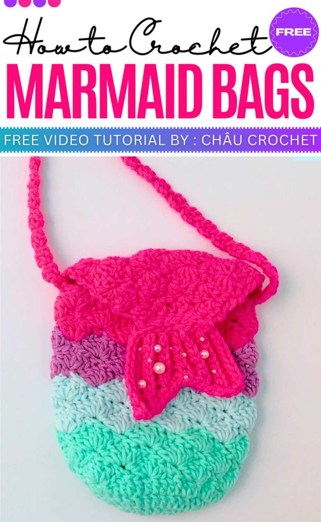 The Mermaid Tail Bag is a textured accessory that shows a “shell” stitch pattern and a distinct tail flap. This design uses a gradient of colors to mimic mermaid scales and is finished with a unique decorative strap and pearl accents.