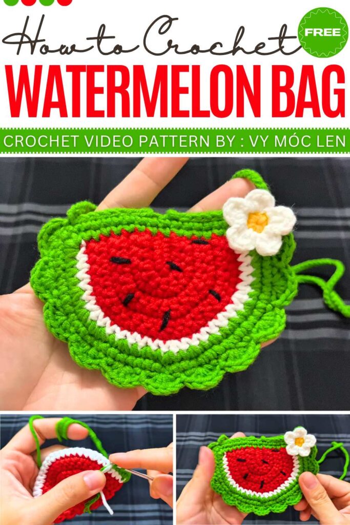 To make the Mini Watermelon Bag, crochet two flat circles for the front and back, then join them with a gusset to create a pouch. The design uses concentric color changes—starting with a red center, followed by a thin white stripe, and finishing with a green rind.
