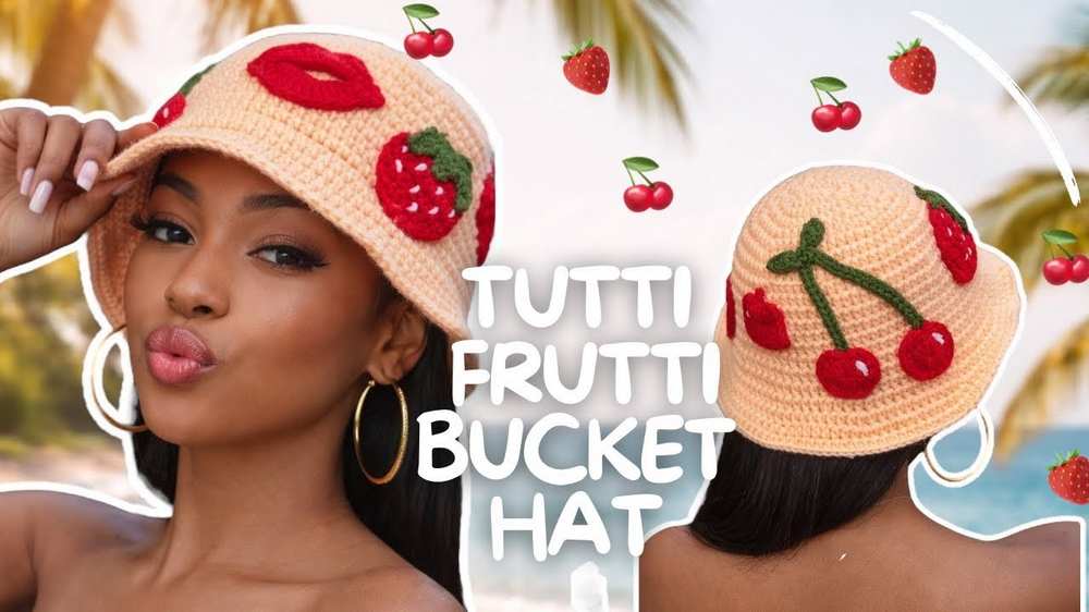 Start with a magic ring and increase in a spiral to form a flat crown. Crochet straight rows to build the body, then work into the front loops to help the brim flare outward. Continue increasing the brim to your desired width and hand-sew a strawberry appliqué onto the side for a decorative finish.