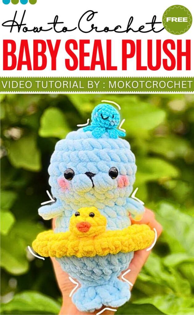 The Swimming Seal Plushie from the tutorial is a “no-sew” project designed to be very fast, specifically because you crochet the fins and tail directly as part of the body. Since it’s made with chunky blanket or velvet yarn and a 6mm hook, it turns out very soft and squishy.