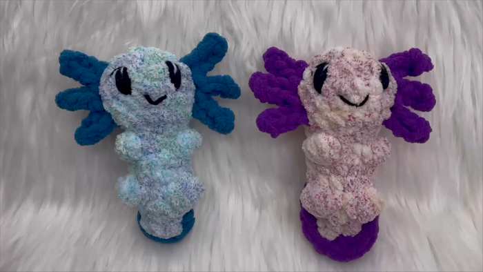 This tiny axolotl is a “no-sew” hybrid between a plushie and a floppy snuggler, designed to be palm-sized and super squishy. Since the limbs are worked directly into the body as one piece, there is zero assembly or tedious sewing required at the end.