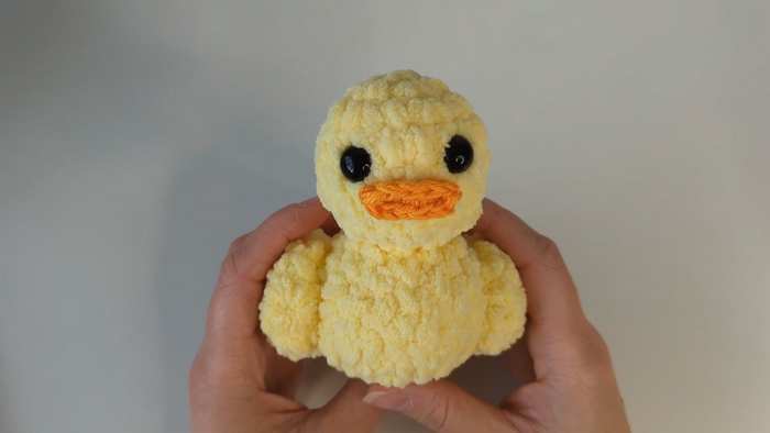 The duck is made by crocheting the head and body as separate spheres using a magic ring and basic single crochet rounds. After adding safety eyes and stuffing, the two pieces are sewn together. The wings are worked as flat, unstuffed shapes and attached to the sides, while the beak is made from a small chain worked on both sides to create an oval.